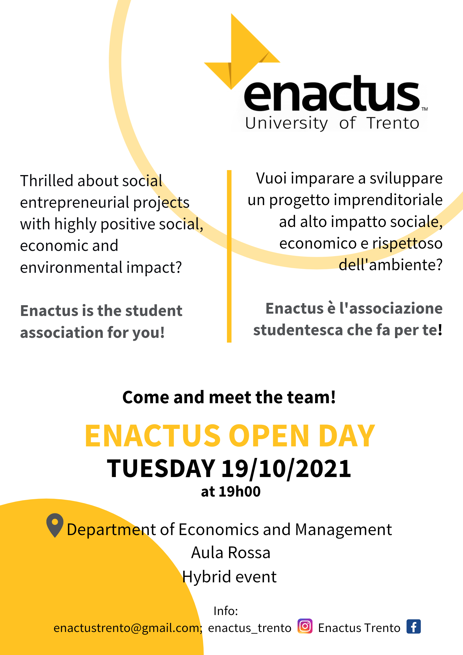 Durante l'evento si parlerà della associazione e dei progetti che vengono sviluppando e alcuni alumni Enactus ti racconteranno le proprie esperienze con Enactus Trento. Inoltre Francesca Chiesa di Enactus Italy si collegherà online per presentare tutte le opportunità che offerte dalla membership Enactus.Enactus è un’organizzazione no-profit mondiale che si occupa di far sviluppare a studenti universitari progetti imprenditoriali a impatto sociale. Inoltre, ha lo scopo di mettere in contatto tra loro studenti, imprenditori ed esperti di settore di tutto il mondo. Ad oggi Enactus è presente in 37 Paesi e in più di 1.700 Università. Ogni anno i team di tutto il network si sfidano prima a livello nazionale e poi a livello globale con i progetti migliori. Ad oggi gli studenti dell'Università di Trento hanno portati avanti svariati progetti sui temi della sostenibilità sociale e ambientale, vincendo l'Enactus National Competition 2017 e qualificandosi tra i progetti finalisti nel 2019 e nel 2021. Per saperne di più vi invitano a partecipare all'evento di presentazione dell'associazione che si terrà martedì 19 ottobre, alle ore 19:00, presso il Dipartimento di Economia e Management dell'Università di Trento (Aula rossa), e che sarà possibile seguire anche online. Per più dettagli e per la registrazione.