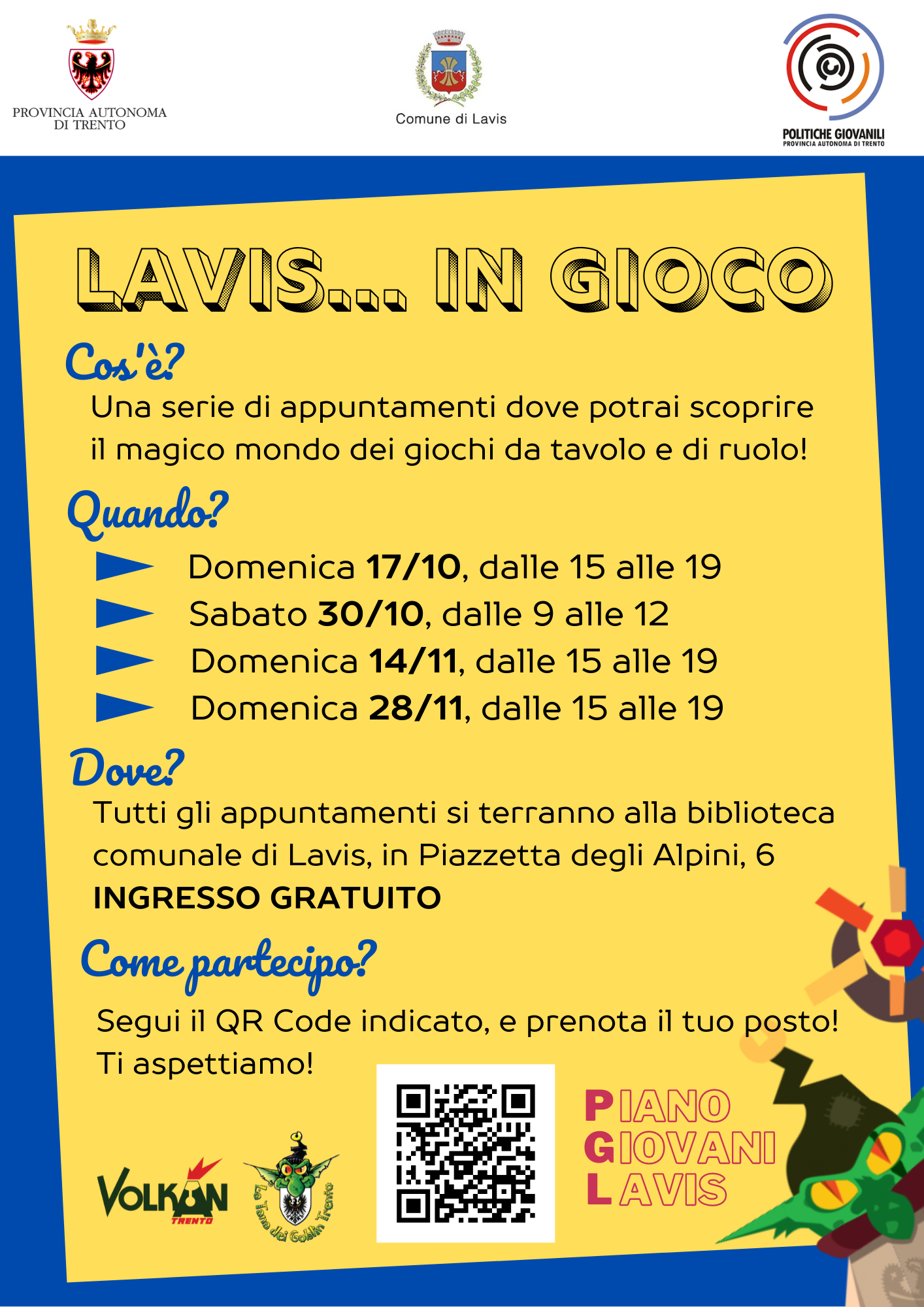 “Lavis in Gioco”, è un progetto nato da un gruppo di ragazzi appassionati di giochi da Tavolo e di ruolo che hanno partecipato alla 2° call del Bando “Inventa il Presente-Immagina il Futuro” del Piano Giovani di Zona di Lavis.