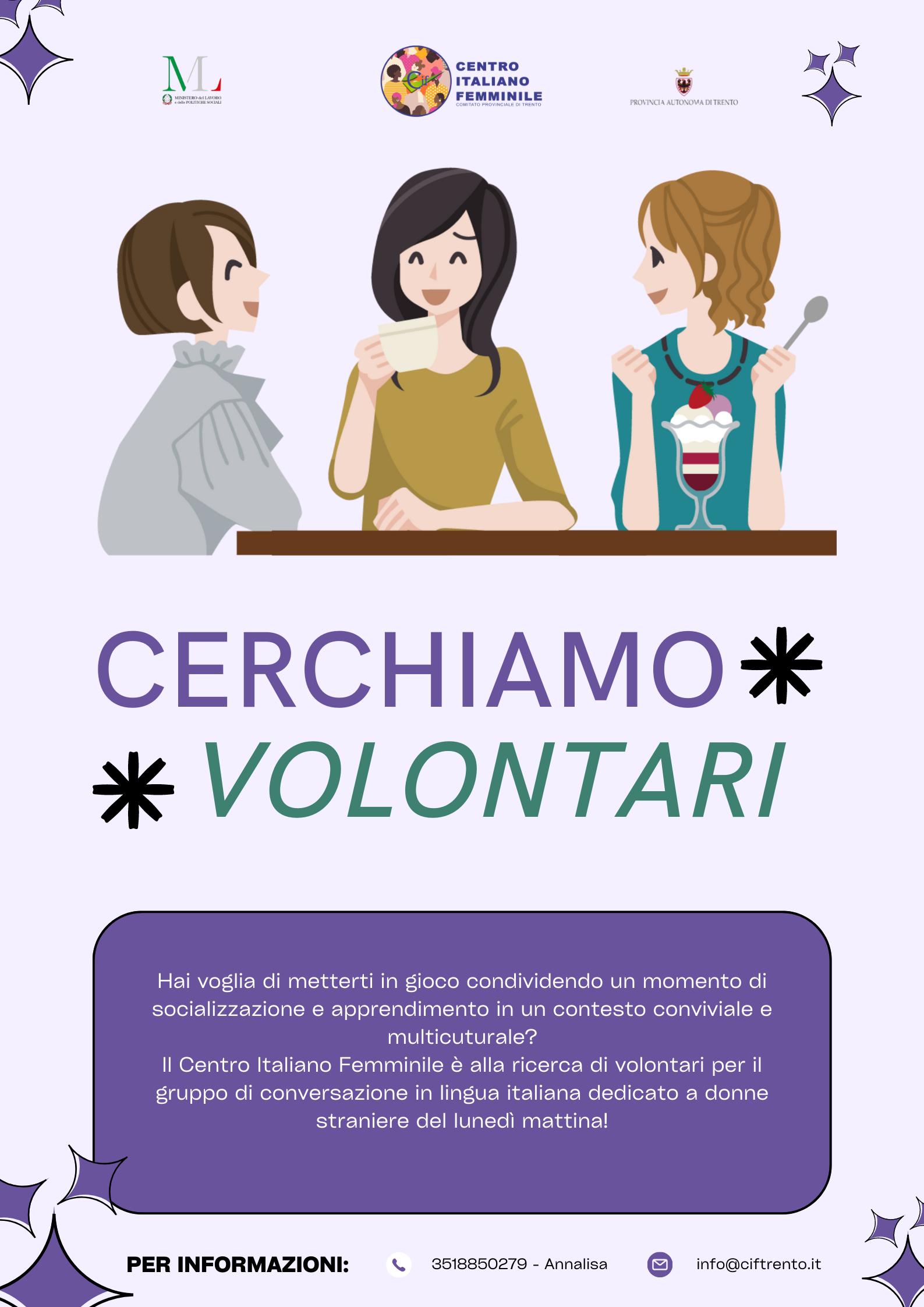 Il Cif, Centro Italiano Femminile, cerca volontari per il nostro gruppo di conversazione in lingua italiana per sole donne! L'attività si svolge ogni lunedì mattina in collaborazione con il Centro di Aiuto alla Vita.