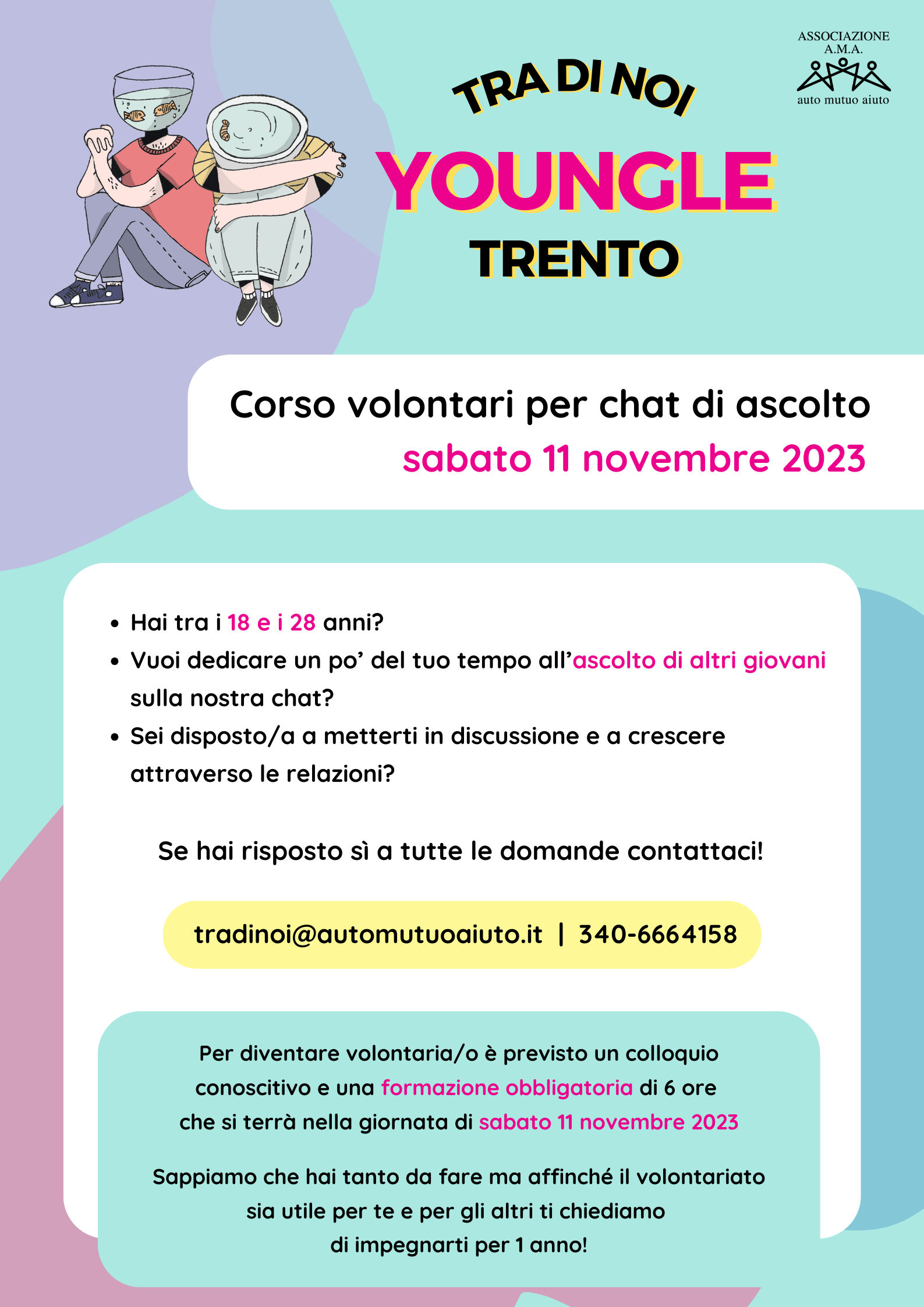 Youngle cerca nuovi volontari per la loro chat di ascolto; se hai tra i 18 e i 28 anni, vuoi dedicare un po’ del tuo tempo all’ascolto di altri giovani sulla nostra chat e sei disposto/a a metterti in discussione e a crescere attraverso le relazioni contatta YOUNGLE!