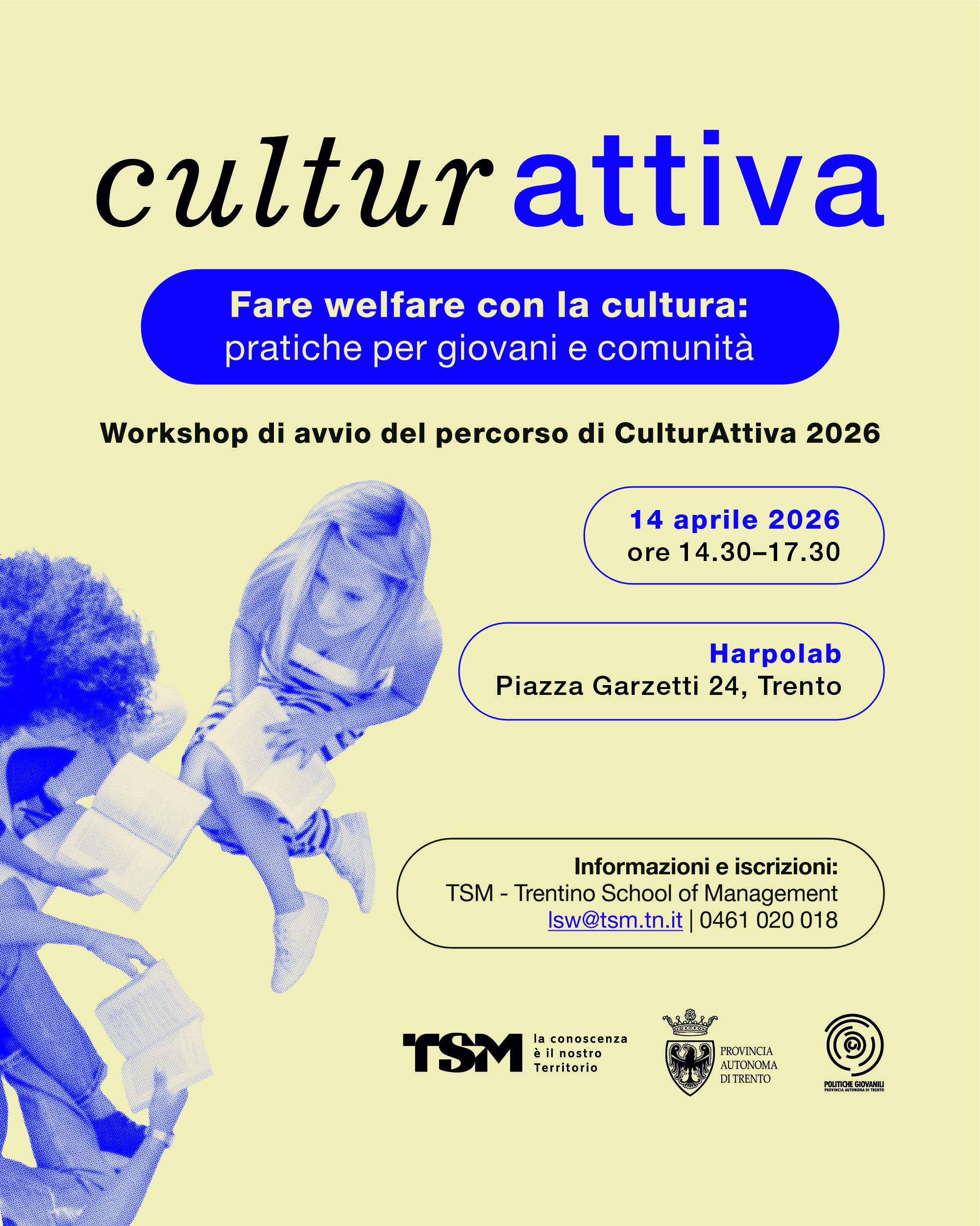 CulturAttiva 2026 promosso dalla Provincia Autonoma di Trento in collaborazione con Trentino School of Management prende il via con un workshop generativo a cura della cooperativa Young inside e dedicato al welfare culturale: uno spazio aperto di incontro, scambio e ispirazione per chi lavora con giovani, comunità e cultura.