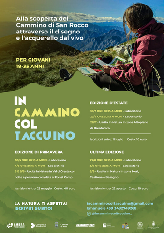 In Cammino Col Taccuino è un progetto per giovani dai 18-35 anni alla scoperta del cammino di San Rocco, tra i comuni di Mori, Brentonico e Ronzo Chienis, attraverso il disegno e la pittura da vivo. Un percorso per scoprire non solo i luoghi del Cammino di San Rocco, ma anche un modo diverso di stare in Natura, di osservarne la sua bellezza attraverso il disegno e l’acquerello.