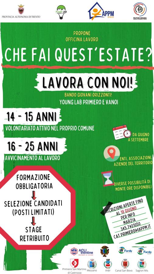 - 16-25 anni, un pacchetto formativo strutturato con la preziosa collaborazione di ACLI PRIMIERO, e un eco-trekking in collaborazione con EcoLogica della montagna, utile per entrare nel mondo del lavoro a cui segue una selezione che dà accesso allo stage retribuito presso enti pubblici/privati/terzo settore del territorio di primiero, vanoi, mis. Gli enti interessati ad ospitare i ragazzi possono contattare il centro di aggregazione e compilare il modulo di accoglienza del tirocinante utile per l'assegnazione dei ragazzi in base alle specifiche esigenze dell'ospitante. I partecipanti minorenni hanno un benefit economico sul territorio. I maggiorenni una retribuzione economica.