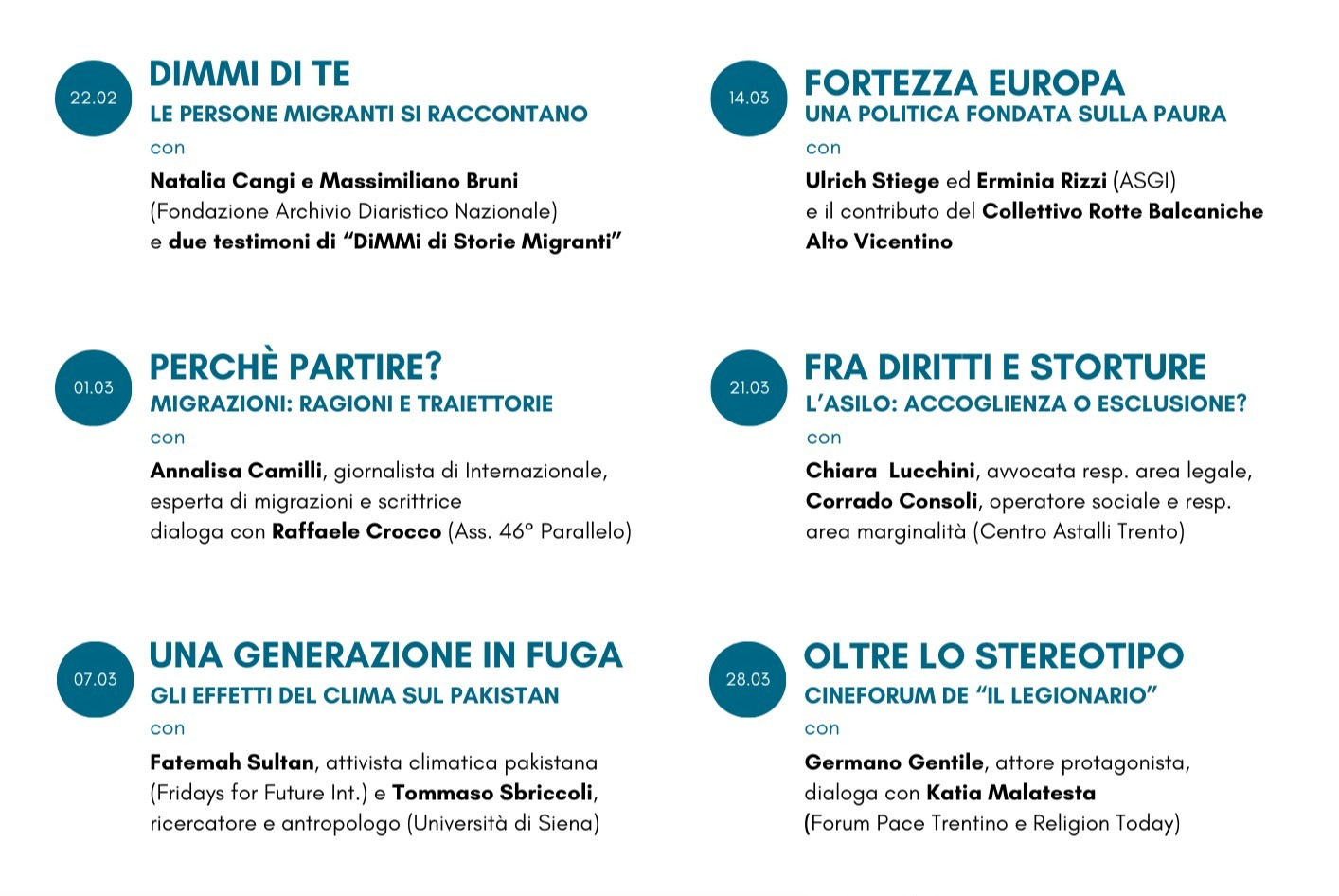 Il corso prevede sei incontri con dodici relatori, affrontando diverse tematiche legate al fenomeno delle migrazioni. Si tratta di un'opportunità per approfondire le cause e le sfide legate alle migrazioni forzate, coinvolgendo ospiti locali, nazionali e internazionali.