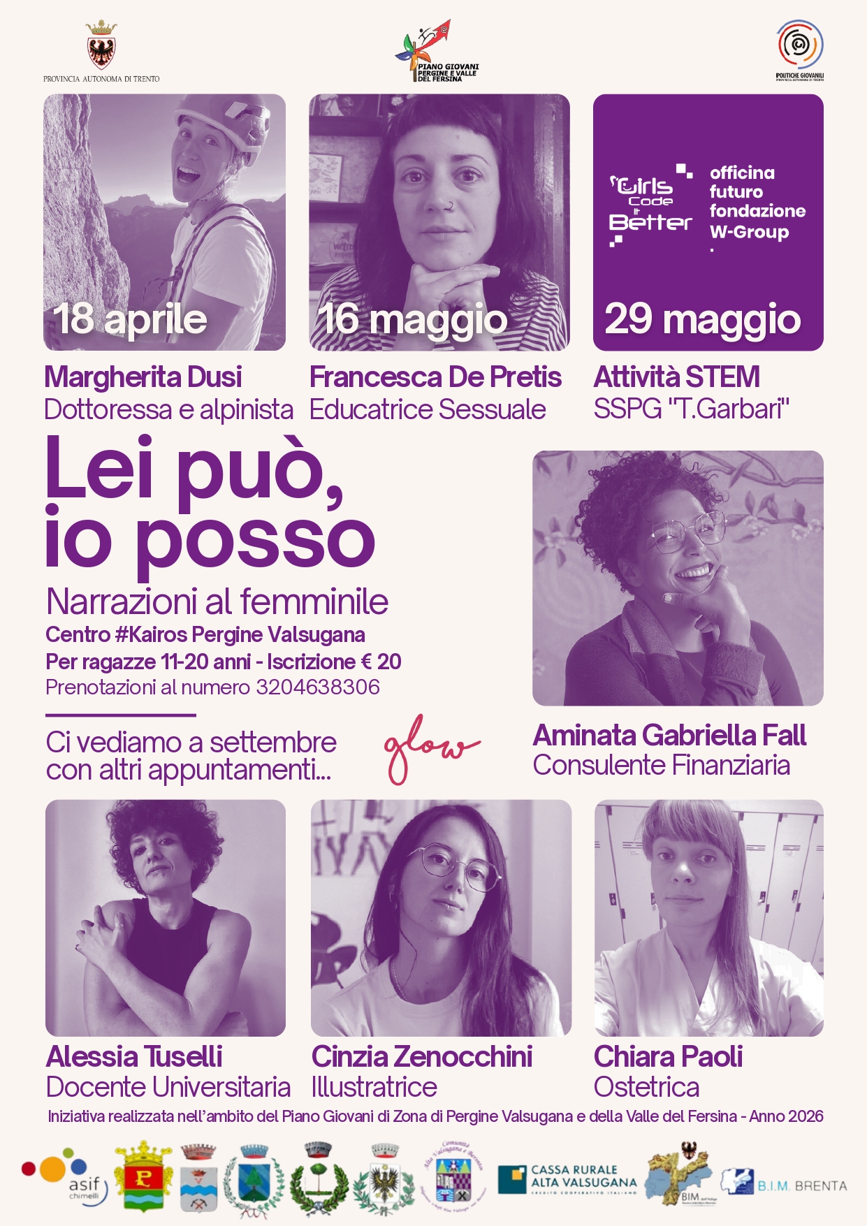 Le prime date vedranno protagoniste la dottoressa e alpinista Margherita Dusi (18 aprile), l'educatrice sessuale Francesca De Pretis (16 maggio), un'attività STEM organizzata dal SSPG T. Garbai (29 maggio).