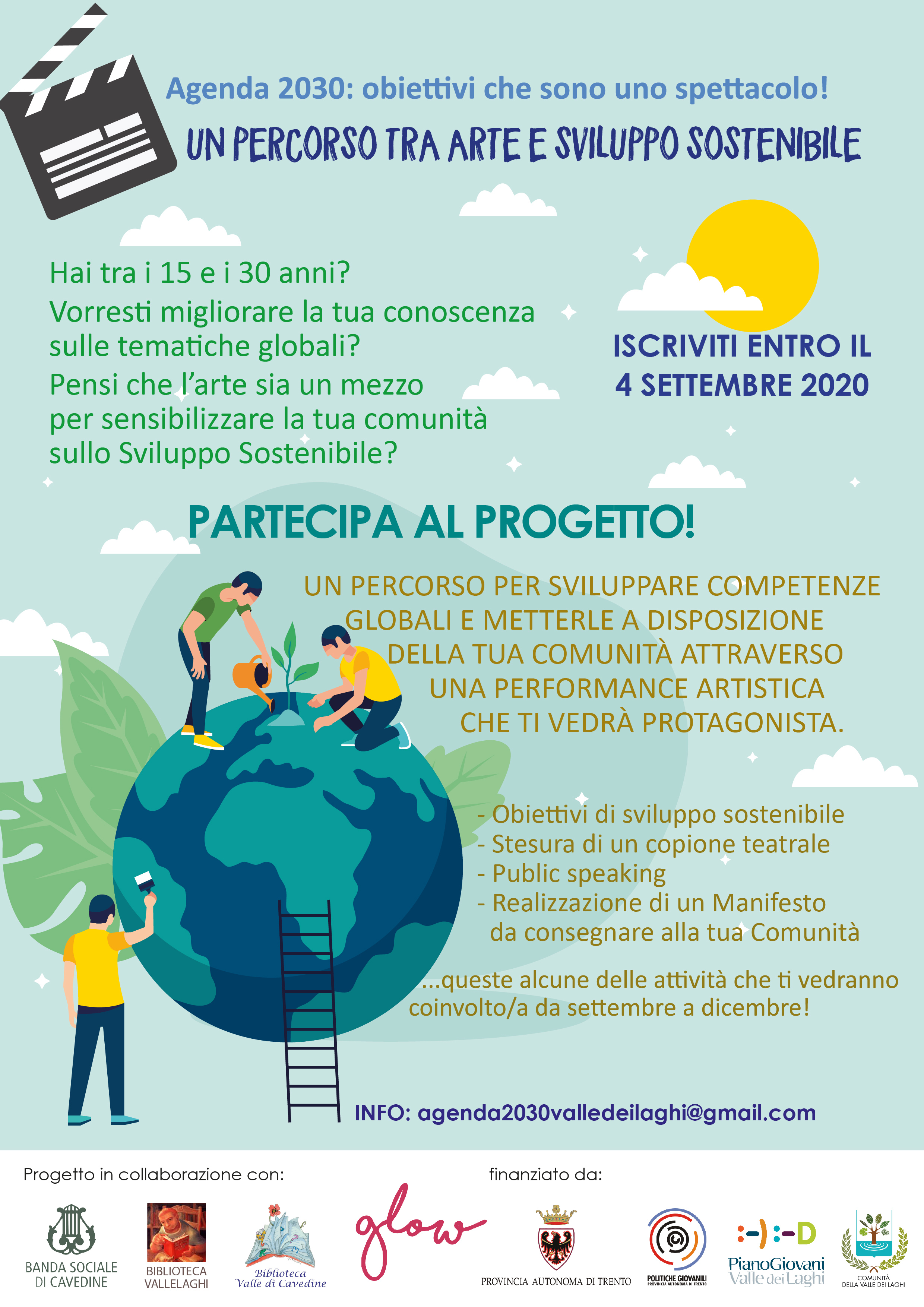 L'Associazione Culturale Glow in collaborazione con le Biblioteche e la Banda Sociale di Cavedine vi invitano a prendere parte al progetto Agenda 2030: obiettivi che sono uno spettacolo!Il progetto mira a promuovere la cittadinanza attiva attraverso un percorso tra Arte e Sviluppo Sostenibile per sostenere l’importanza dell’impegno e dell'attivazione dei e delle giovani verso le grandi sfide locali e globali individuate nell'Agenda 2030.Per maggiori informazioni: agenda2030valledeilaghi@gmail.comIl progetto è finanziato dal Piano Giovani Valle dei Laghi e dalla Provincia autonoma di Trento.
