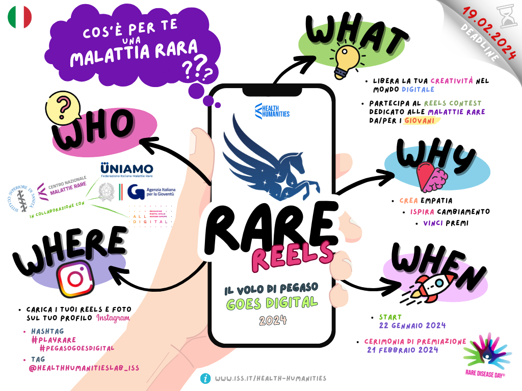 Il concorso video "RARE REELS: Pegaso goes digital!" premia opere sulle malattie rare ed è ora in versione digitale dedicata ai giovani su Instagram. Per partecipare è necessaria la condivisione di un breve video (15-30 secondi) che esplori il concetto di malattia rara, promuovendo empatia e sfidando stereotipi con gli hashtag #playrare e @healthhumanitieslab_ISS.