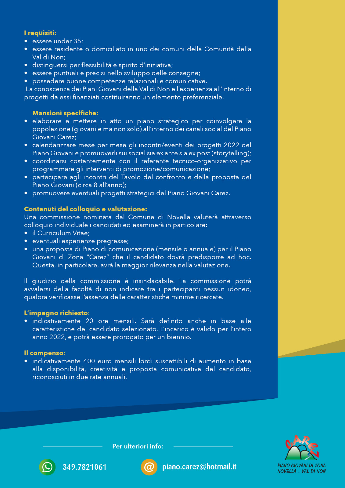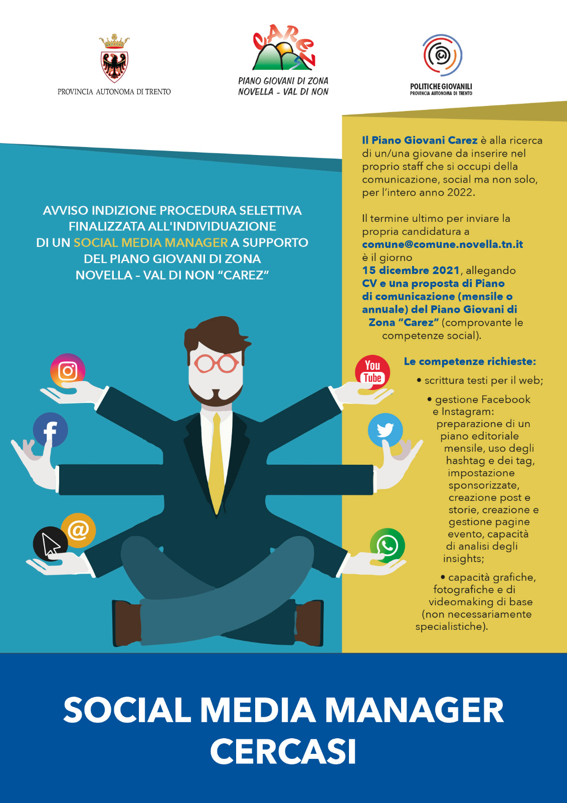 Il Piano giovani Carez cerca un Social Media Manager per affiancare il Referente Tecnico-Organizzativo nella comunicazione e promozione del #pianogiovanicarez.