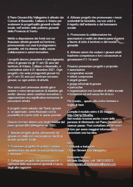 I progetti devono prevedere il coinvolgimento attivo di giovani tra gli 11 ed i 35 anni del territorio di Volano, Calliano e Besenello, e concludersi entro il 31 dicembre 2021.
